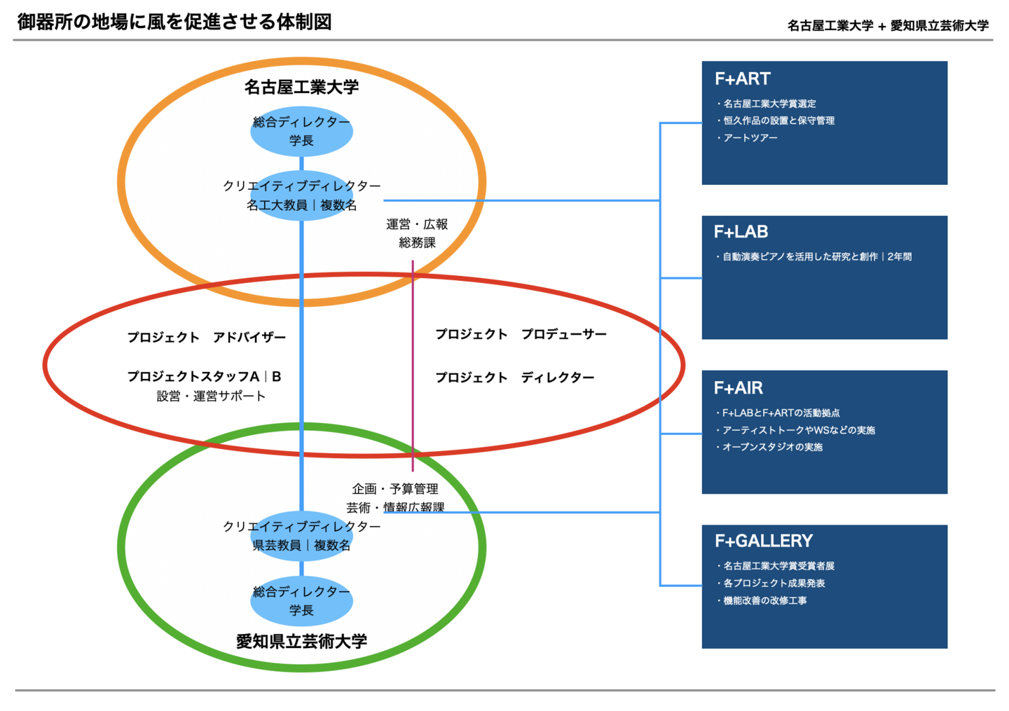 高度な工学の基盤である御器所キャンパスに、触媒としてアートを織り交ぜることにより、工学・芸術・技術・文化・伝統・歴史、そして人との間で様々な化学反応をもたらし、未来社会構築のための共創的な技術創出のためのプラットフォームへと進化する。また、日常から芸術に触れ、その経験及び価値感を共有することによって、有為な技術者・研究者である前に、ひとりの人間として豊かな心を育む場を提供する。
